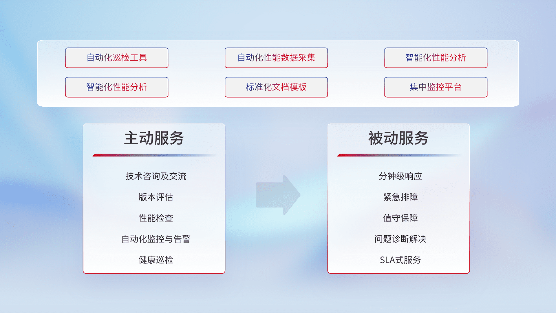 智能化工具和标准化文档,,,,保障服务质量,,提供主动服务(包含技术咨询、、版本评估、、、、性能检查、、自动化监控与告警、、、健康巡检)和被动服务包含(分钟级响应、、紧急排障、、、值守保障、、、问题诊断解决、、SLA服务)。。。
